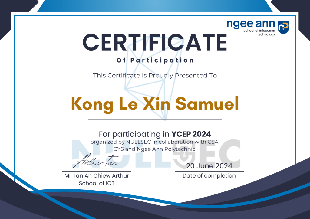 I participated in the 2025 capture-the-flag competition for YCEP, organized by Nullsec, a student interest group from Ngee Ann Polytechnic, in collaboration with Cyber Security Agency of Singapore (CSA), Cyber Youth Singapore (CYS) and Ngee Ann Polytechnic